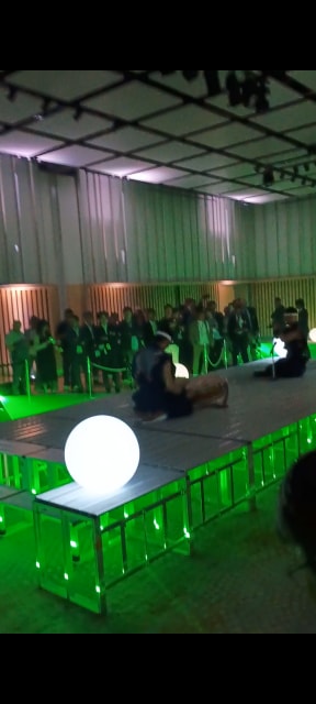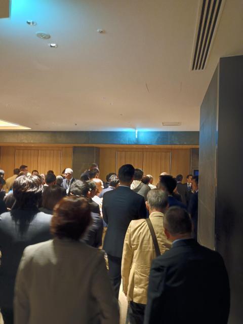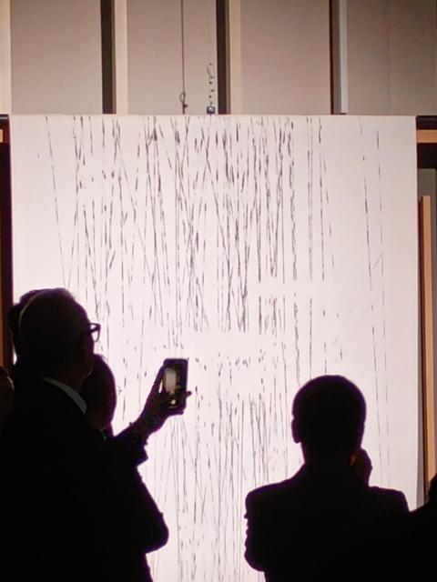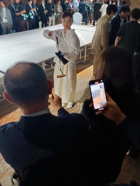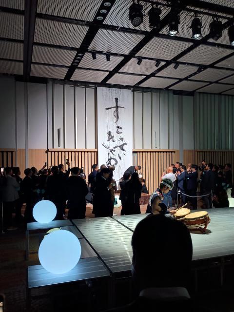 笛と太鼓の2人が真ん中のステージで気分を盛り上げてくれます。続いて書道家「中澤希水」さんの入場です。あの大きい半紙は!我々が描いたパッティングの軌道です。