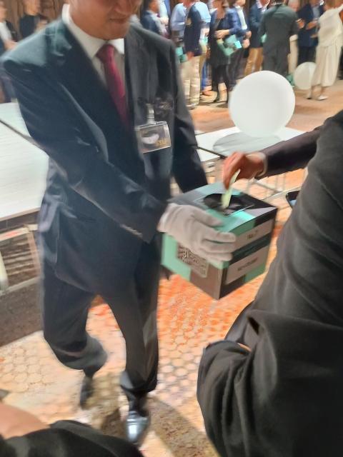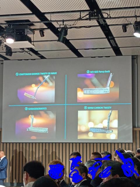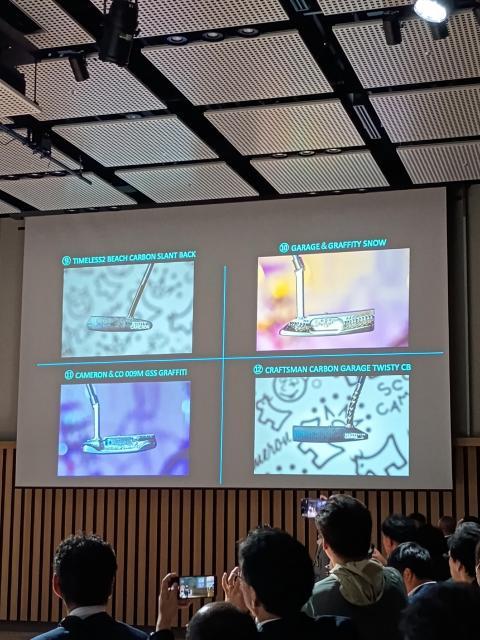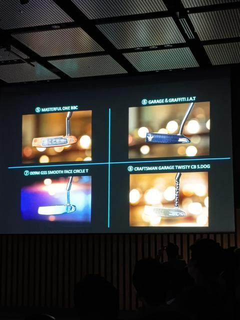 その投票BOXに、我々がぶら下げている名札に付属する投票券を1つずつ投票するのです。もちろん1つのパターに1枚のみ投票可、複数の投票が確認されると無効となります。どのパターもスペシャルパターの名に相応しい装飾、カラー、ツイストネック、刻印が施されています。素材形状も様々なタイプがありました。皆、パターが近くに来たら携帯でしっかりと画像に収めます。私もそうしていたのですが...こちらのインスタに明るい場所で価格と共にきっちりと撮影された投稿がありますので、ご覧ください(笑)