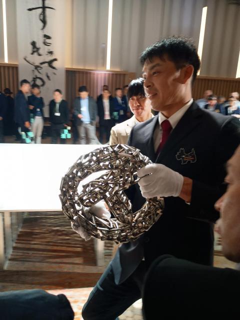 価格は181.5万円~346.5万円です。価格もスペシャルです。毎日がスペシャル竹内まりやです。有識者から旧ツイッターことXでリプを頂きましたが、数年前のおおよそ2倍程の価格になっているそうです。コロナ禍以降の買い占め、高騰そういった状況が続いています。さて私の投票状況はというと、「うーんこの装飾は~」とか「これは好きな形状じゃないな~」とか二の足を踏んでいたので、一切投票することはありませんでした(笑)転売目的じゃないですし、この回に参加しているやつで、そんな不届き者はいないでしょう!メルカリで見張るよ!(おいおいアクセサリー類いっぱい出品されてるやんけ...)デラックスパターは10本ほど申し込んだので、そちらが当たるのを願うのみ。次々に投票権が引かれて行き、最後13番目にはスカルプチャーが発表されました。パターネックを組み合わせて溶接し、製作されたサークルTの置物です。約5kgとの事。ネックの重量が1つ20gだとすると、およそ250本のネックを使用して作られている事になります。